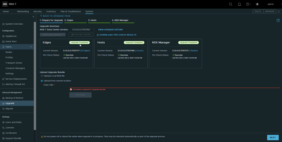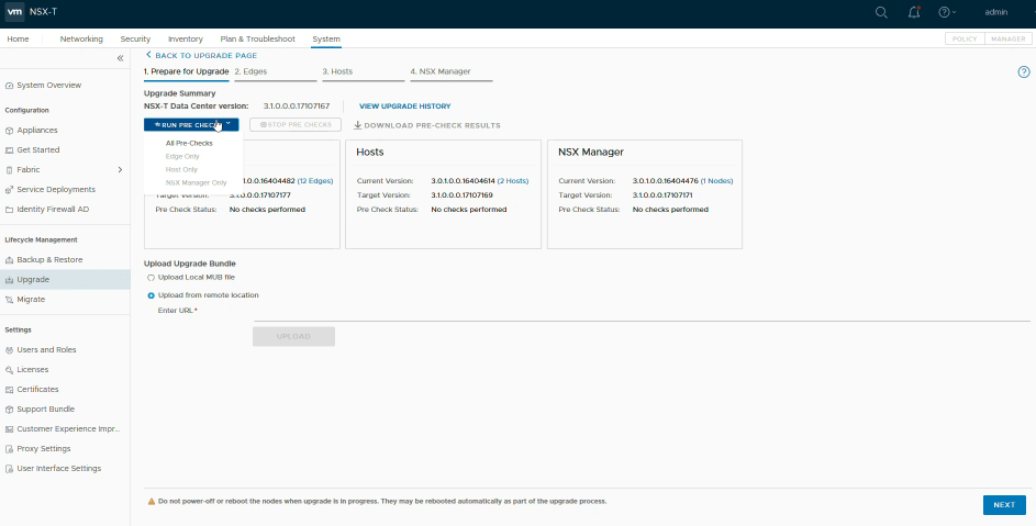 The Upgrade Coordinator will take you through the many steps to get the NSX-T Data Center environment. First thing to do is get the NSX Upgrade Bundle which will take up nearly seven gigs on your hard drive and over your network connection. That used to be a big deal, right?