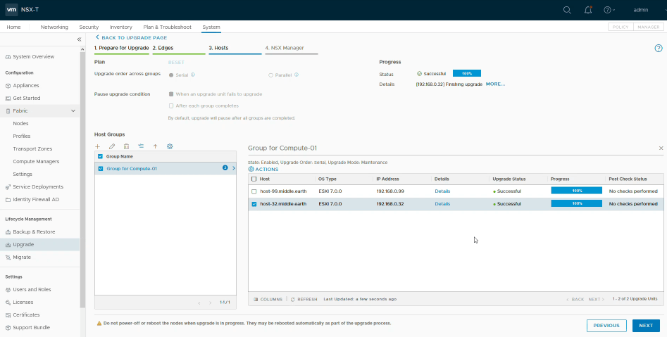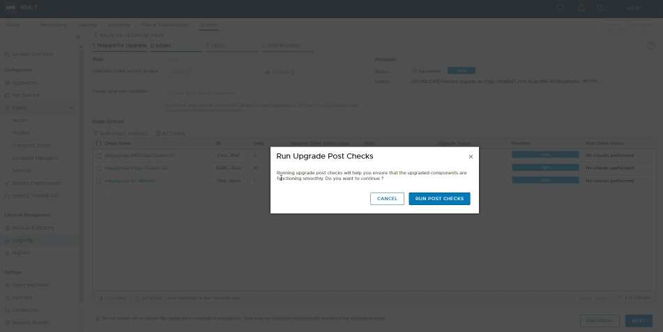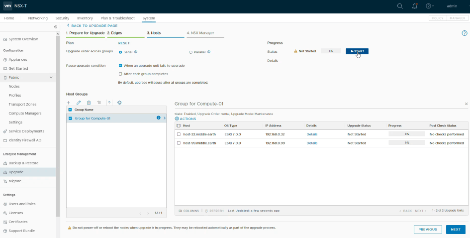 At this point, we are going to upgrade the Transport Nodes (ESXi Hosts) within their clusters to the version desired. Similar to the Edge Nodes, we can choose Serial or Parallel order across the groups. Also, a post upgrade check can be run on the hosts, as well.