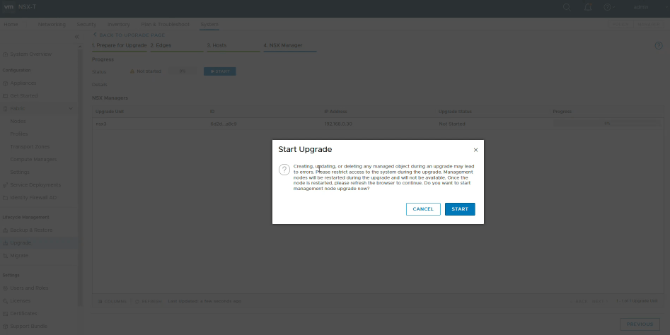 It is recommended that you run a backup of the NSX Management Cluster prior to continuing with the actual Upgrade. Certainly you have a current backup, right?