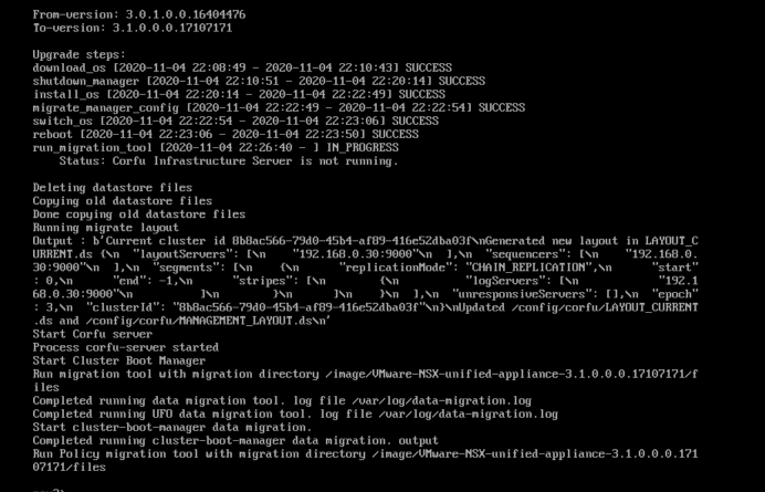 The NEXT will now move to the Manager Nodes. After reading a warning, proceed with the upgrade. The Manager upgrade will cause the node to disconnect and if using the VIP, another Management node will take control of the VIP address and you can follow the progress there. With a single node (PoC or Lab ONLY), the disconnect time will probably last nearly 30 minutes. It is also possible to track the progress of the upgrade through the CLI of the Manager, as seen below.