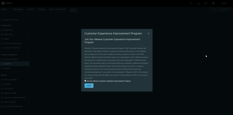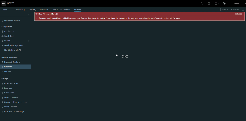 Once reconnected, viola, the newest version of NSX-T Data Center is installed. The default of NSX-T 3.1 UI is the dark mode. One more step is needed. We have to restart the install-upgrade service through the CLI.